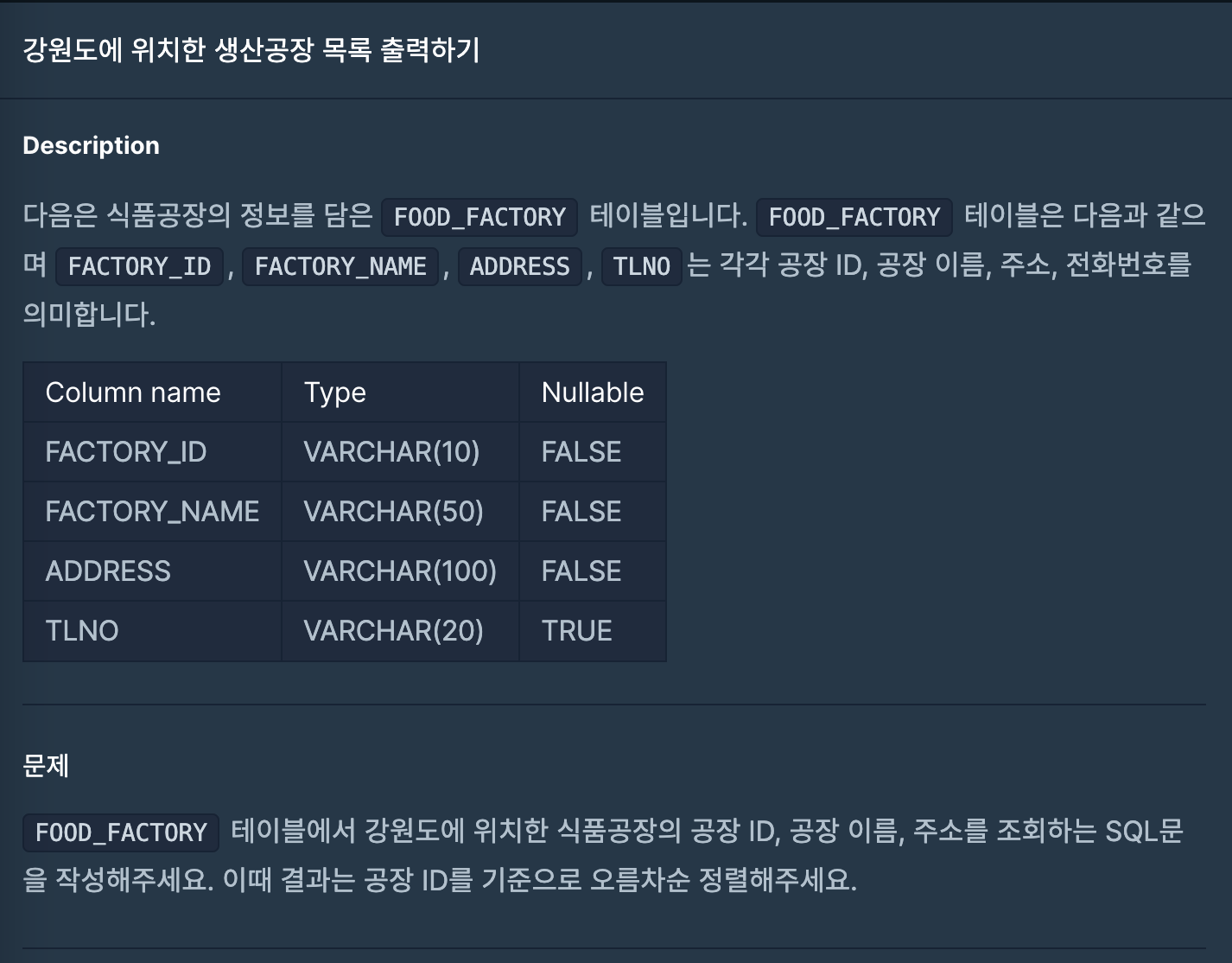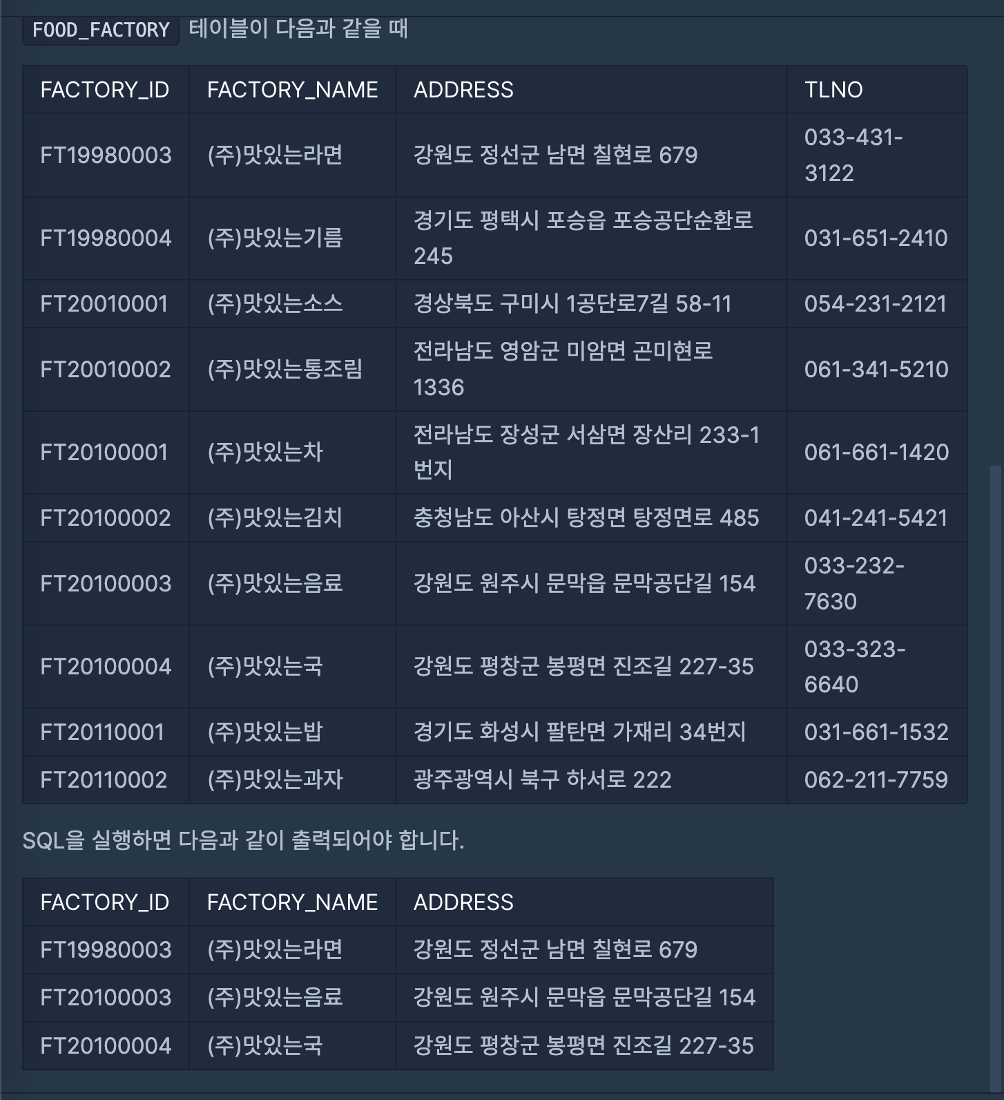 problem1: 강원도에 위치한 생상공장 목록 출력하기(level1)
