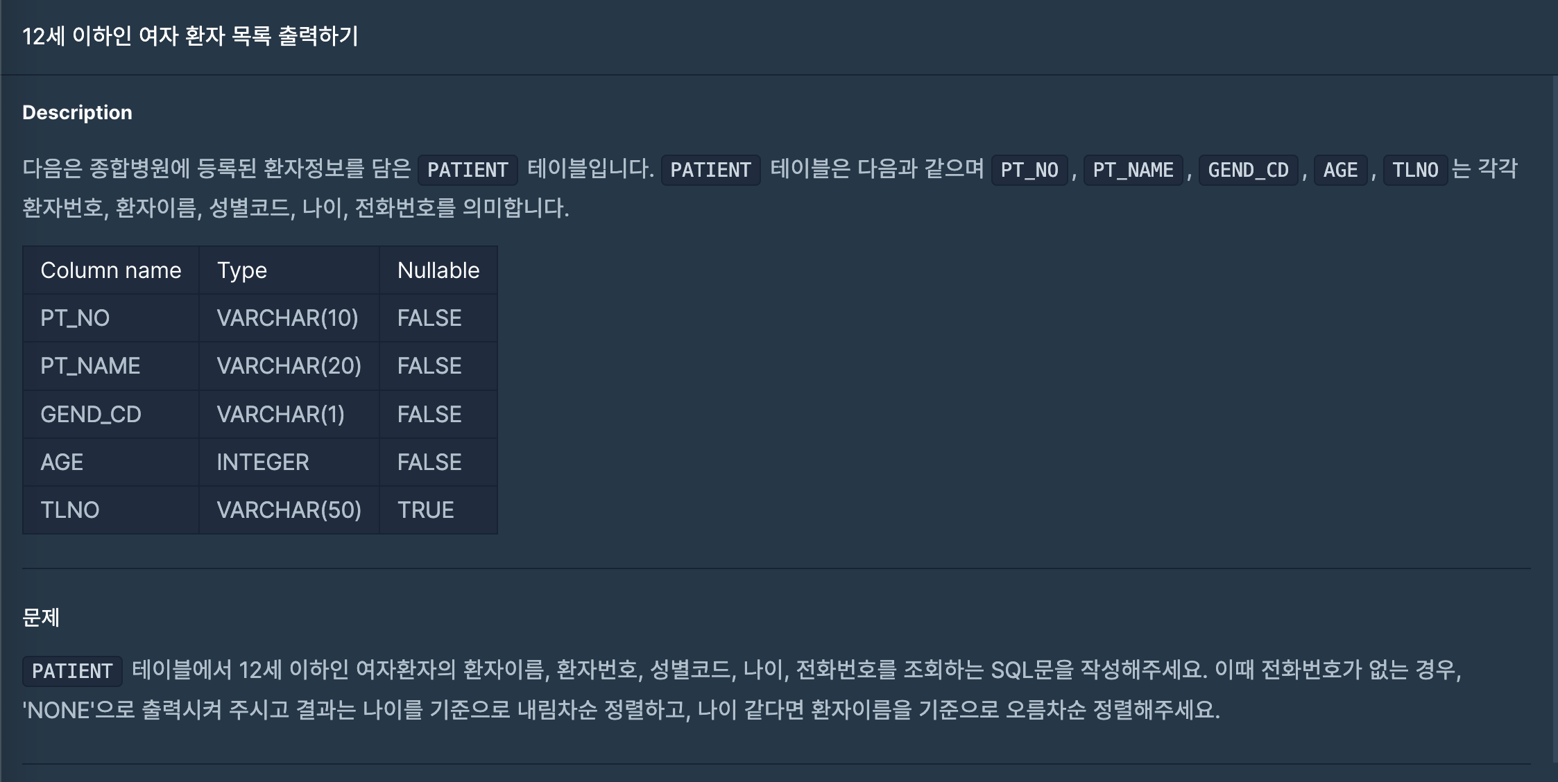problem10: 12세 이하인 여자환자 목록 출력하기(level1)