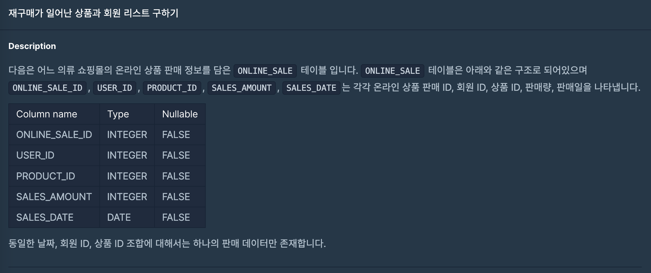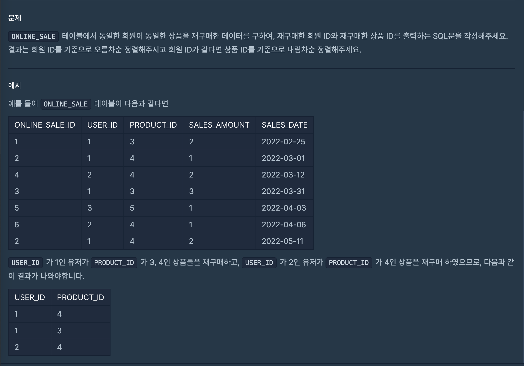 problem12: 재구매가 일어난 상품과 회원 리스트 구하기(level2)