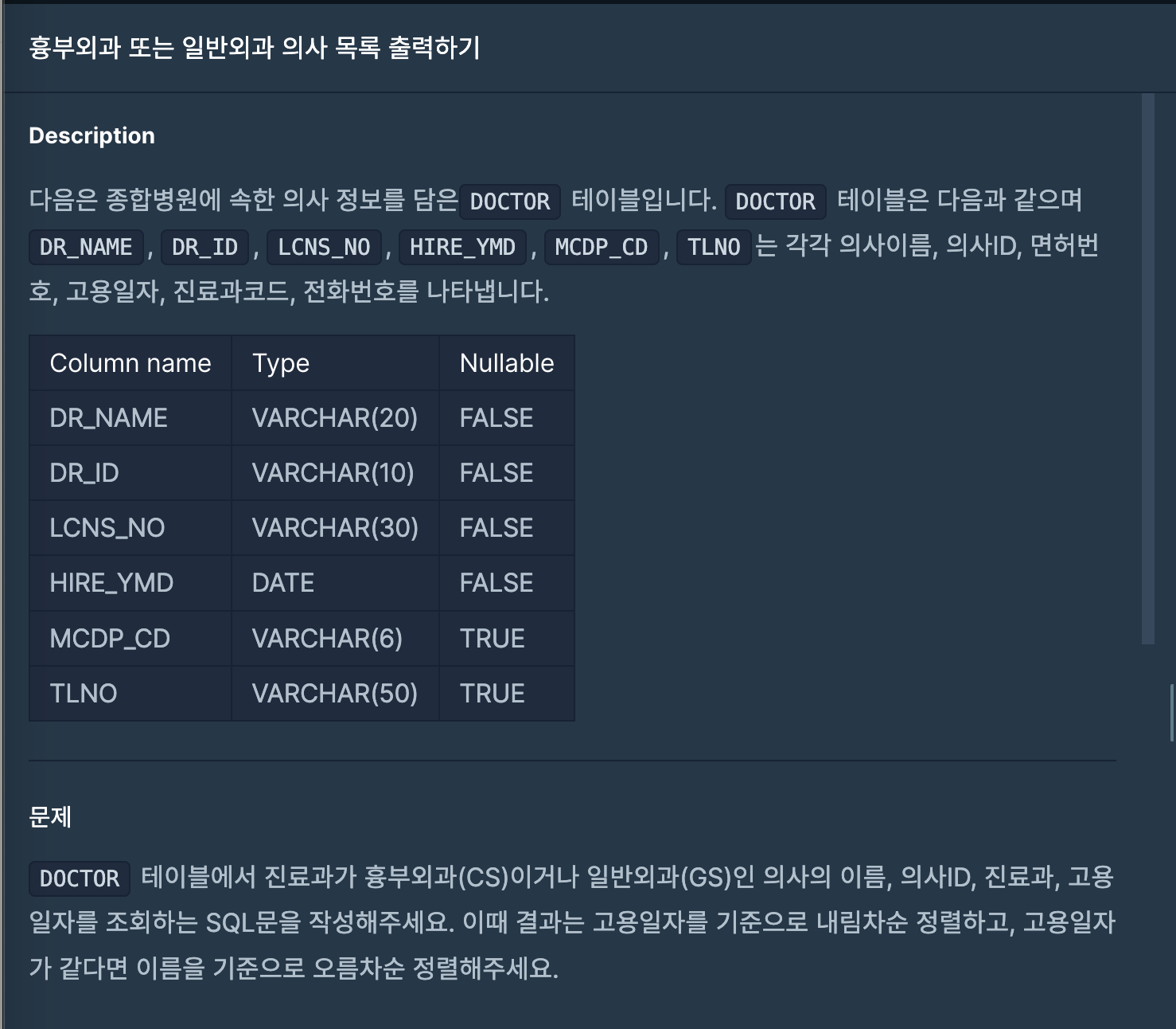 problem2: 흉부외과 또는 일반 외과 의사 목록 출력하기(level1)