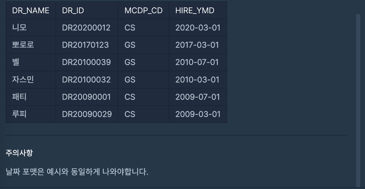 select DR_NAME, DR_ID,MCDP_CD, DATE_FORMAT(HIRE_YMD,"%Y-%m-%d") as DATE_FORMAT