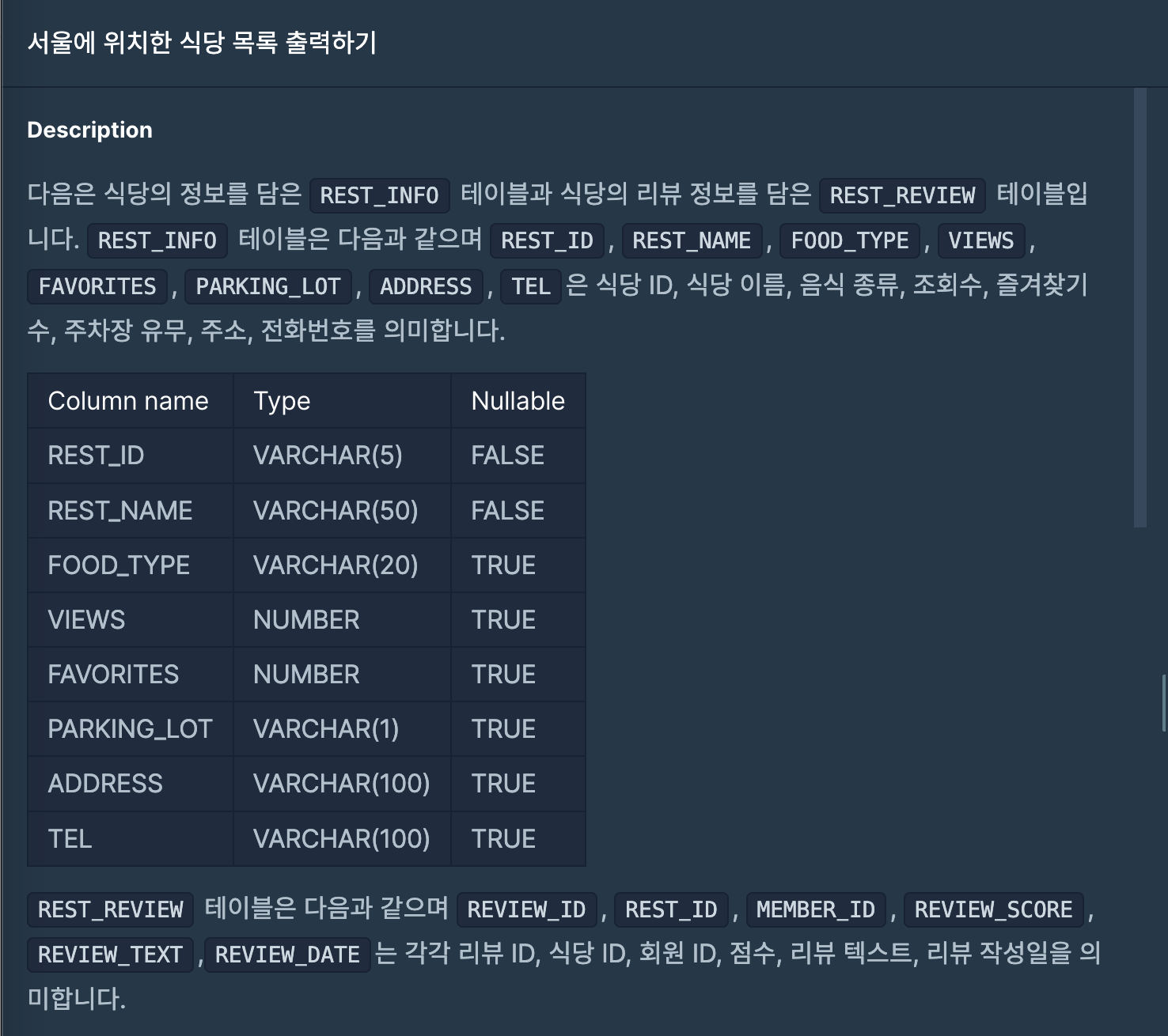 [어려운문제] problem3: 서울에 위치한 식당 목록 출력하기(level4)