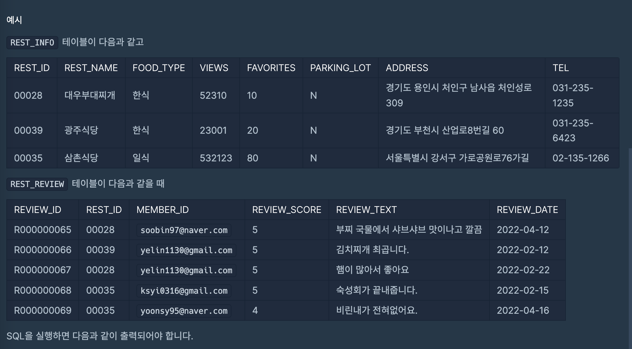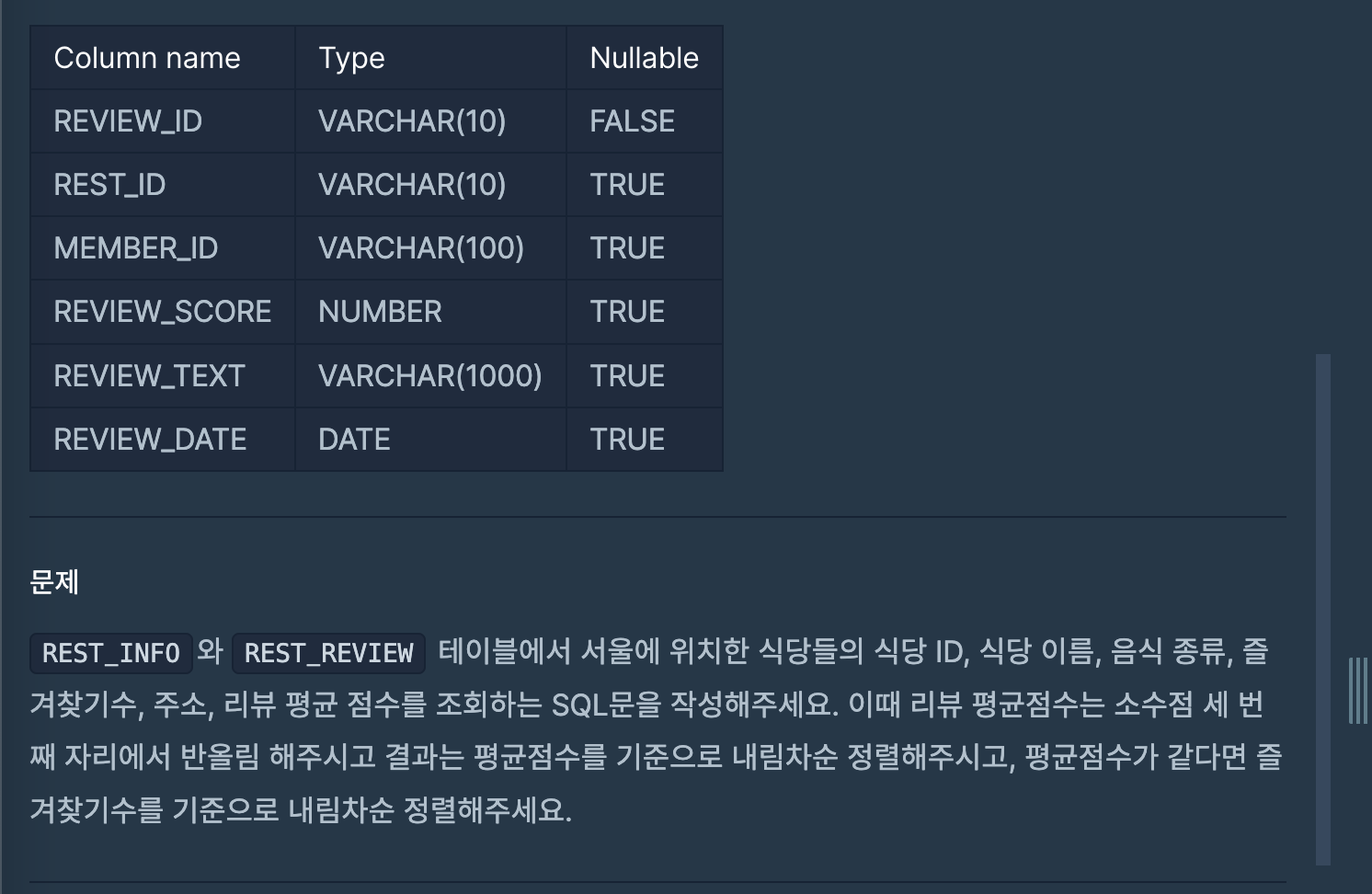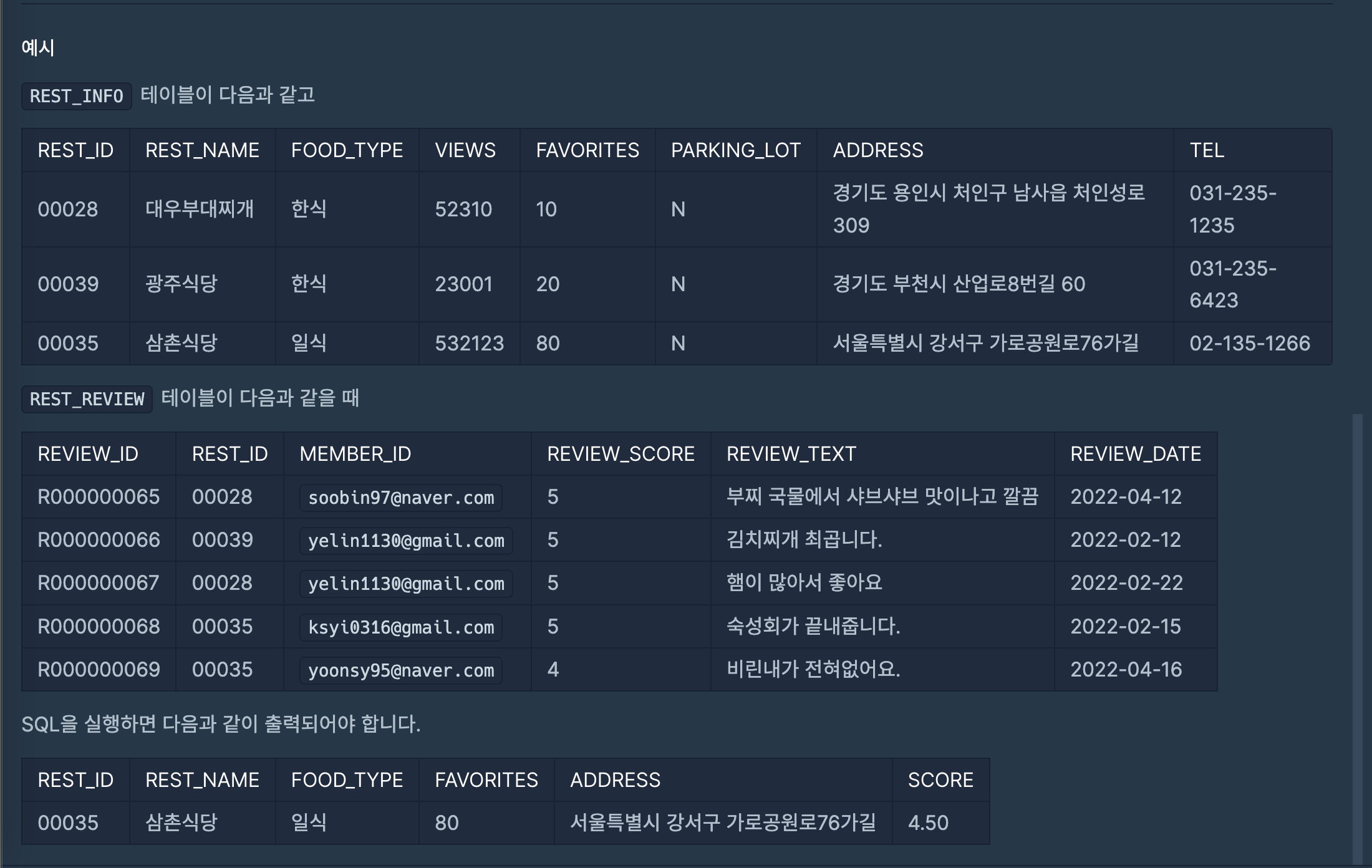 -> 마지막으로 select문을 만들어야 한다. 문제에 "식당 ID, 식당이름, 음식 종류, 즐겨찾기수, 주소, 리뷰 평균 점수를 조회" 를 참고해서