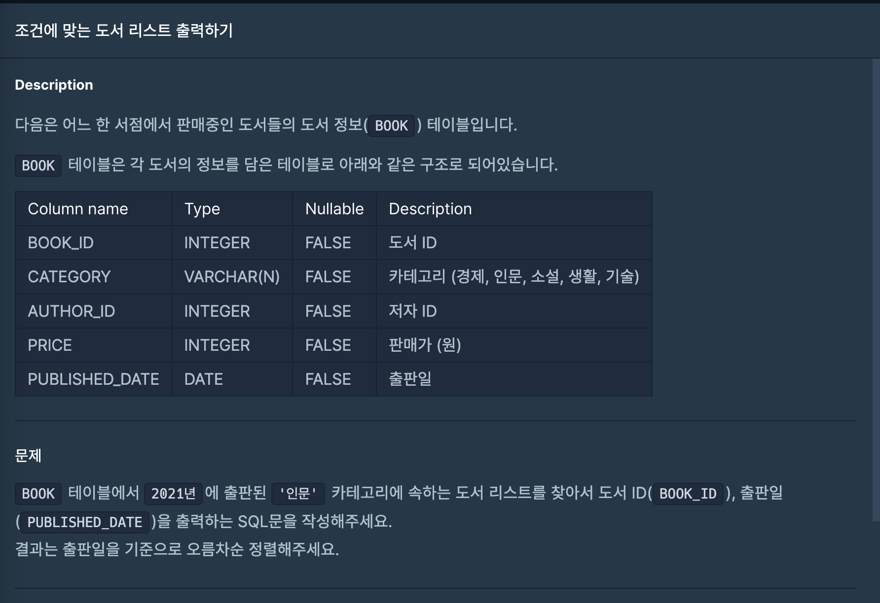 하나의 table, book에서 조회한다. 어려운건 없다. from부터 시작한다. 조건은 2021년과 “인문” 카테고리다. 그리고 ID(BOOK_ID), 출판일 (PUBLISHED_DATE)을 출력한다.