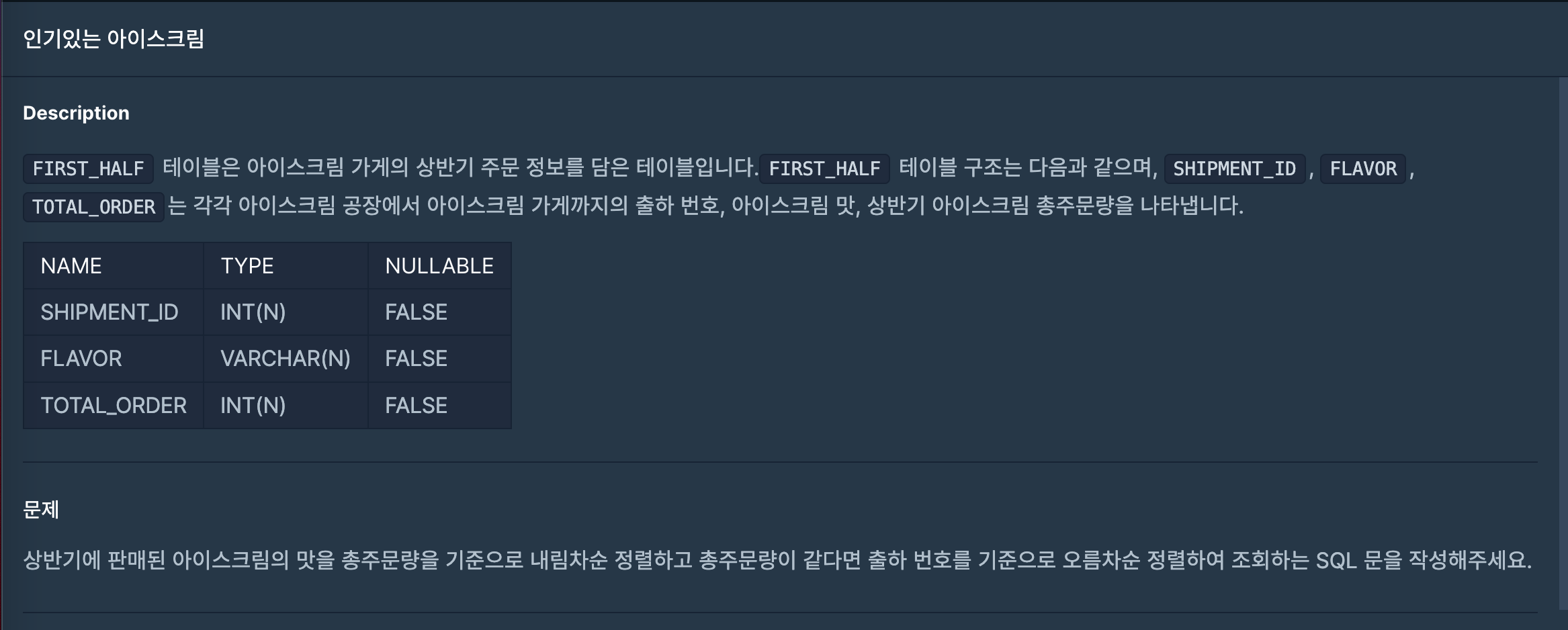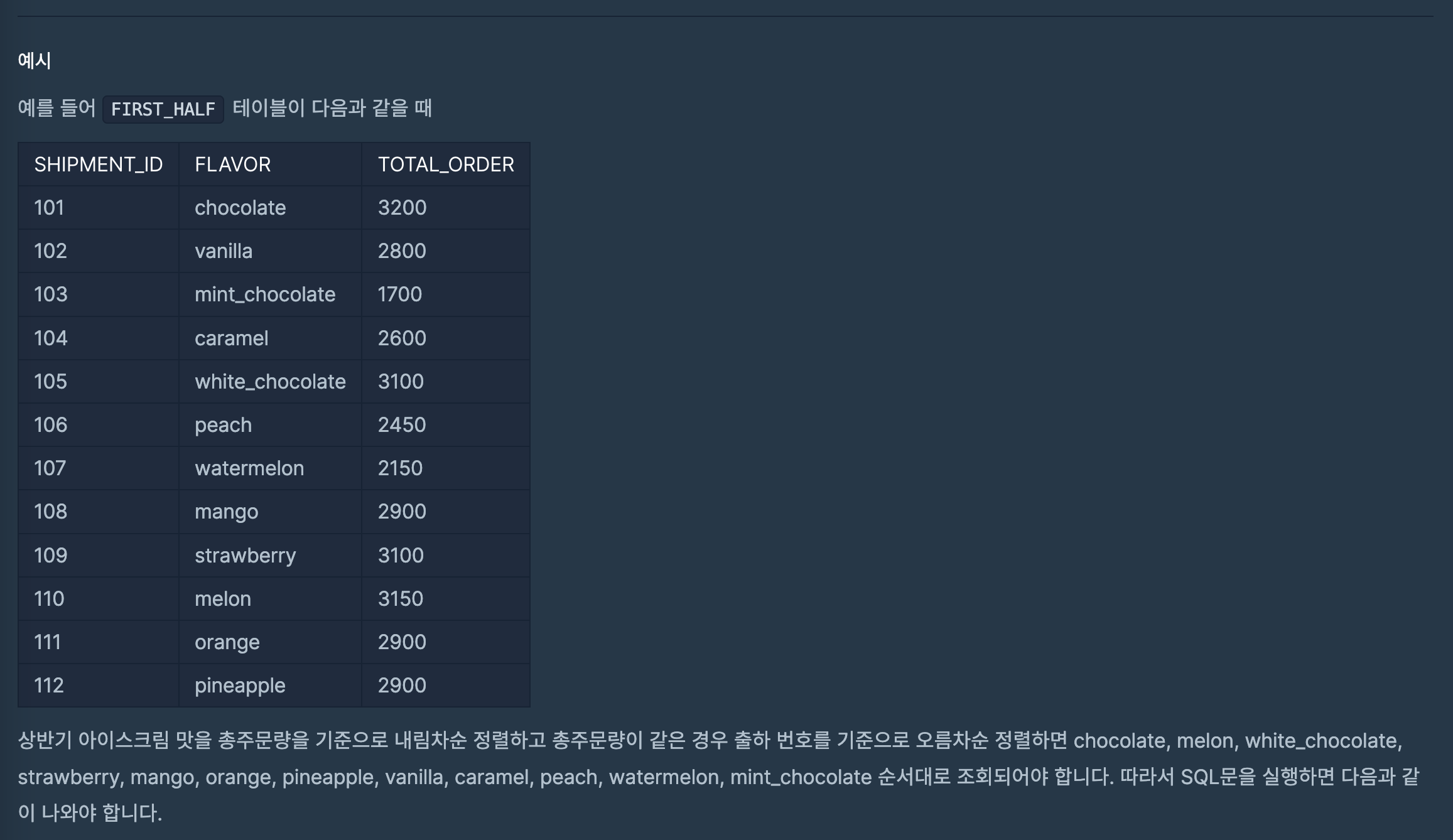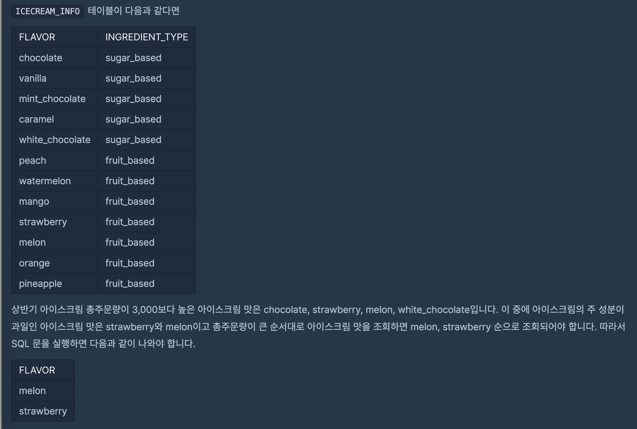 조건문은 "상반기 아이스크림 총주문량이 3,000보다 높으면서 아이스크림의 주 성분이 과일" 이다. 여기서 상반기는 table자체가 상반기