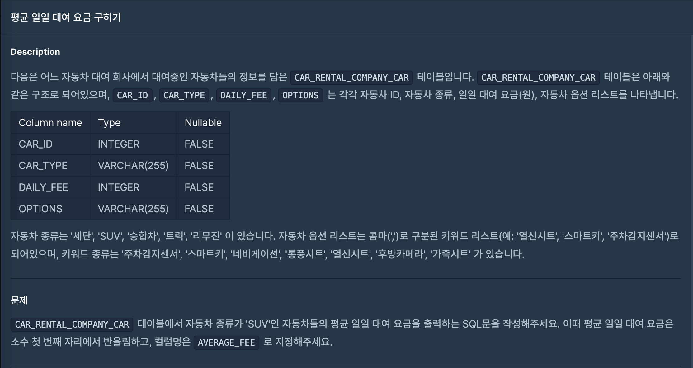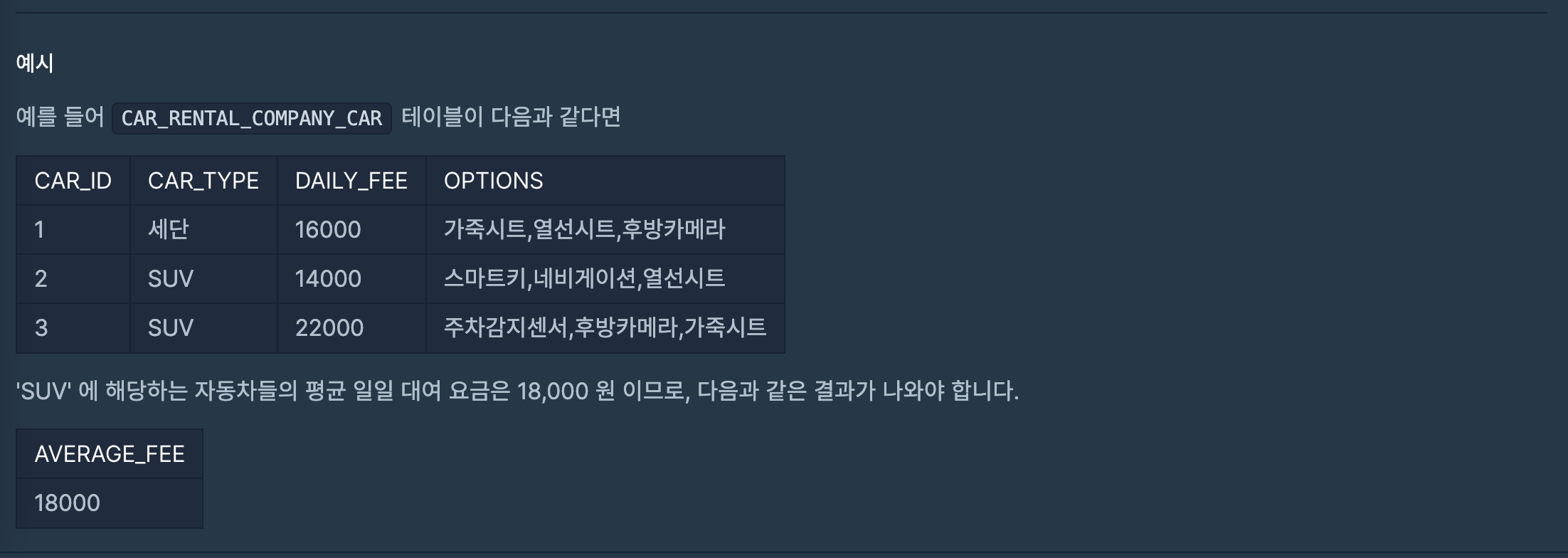 문제를 읽어보면, 평균 일일 대여 요금 이란 말이 나온다. 이것은