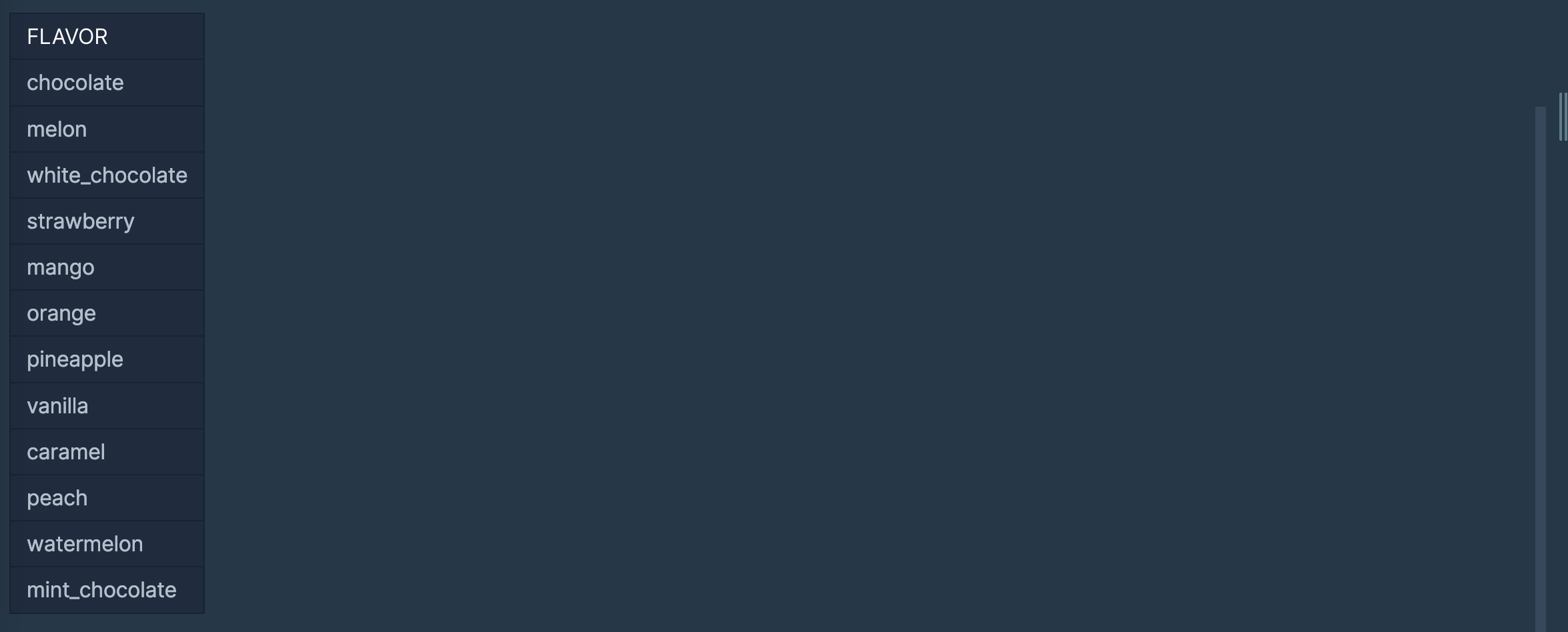 join을 해야하는데, 공통으로 사용될 키를 보면 flavor가 있다. 두개의 key의 이름이 같기 때문에 on이 아니라 using을 사용한다.