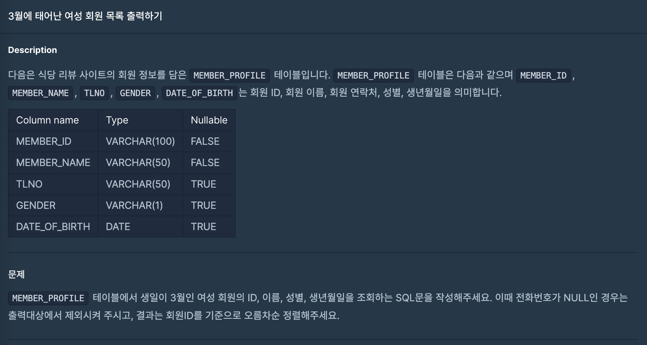 problem9: 3월에 태어난 여성 회원 목록 출력하기(level2)